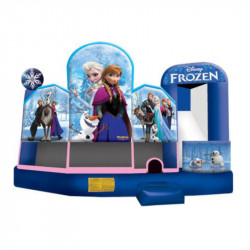 This Frozen themed 5-in-1 combo style bounce house offers a basketball hoop, and both log and pop-up obstacles. It has a climbing area and an exit slide for hours of active fun! Parents are given a clear view with the 360 degree mesh sides. Can fit 10-12 kids at once. 18’x20’x15’